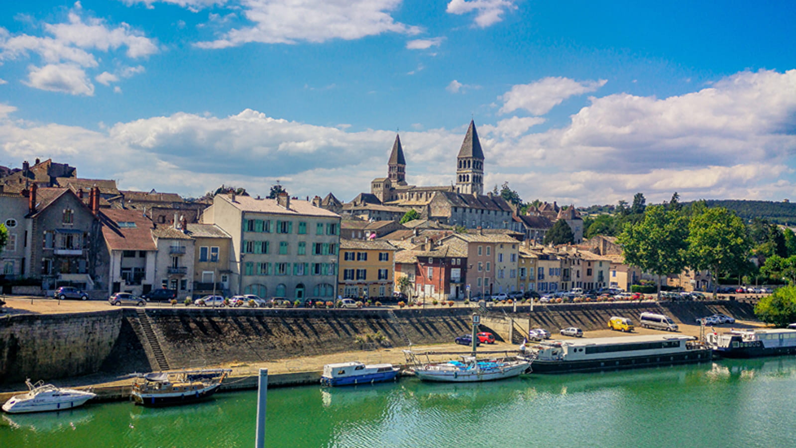 Heute fahren wir zunächst flussaufwärts der Saône entlang nach Tournus. Das kleine Städtchen mit dem Beinamen «Perle im Süden Burgunds» liegt malerisch am Ufer des Flusses und beherbergt mit der Basilika Saint-Philibert ein absolutes Meisterwerk der romanischen Kunst. Das Stadtzentrum mit hübschen Gassen und vielen guten Restaurants laden zum Einkehren ein.